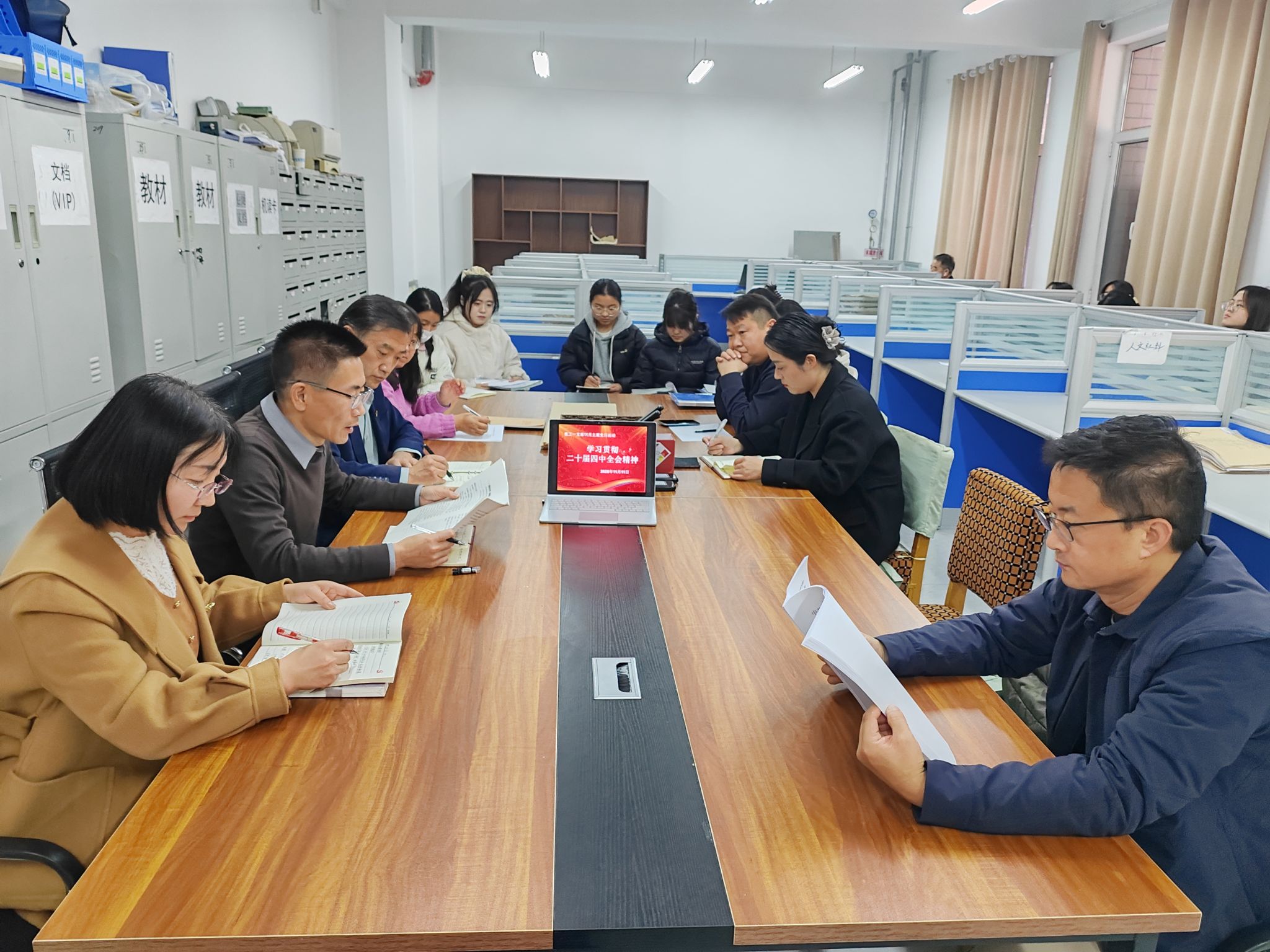 为进一步增强师生学习的主动性,主题党日选择在学院教研室举行,在亲切的环境当中,师生围绕党的二十届四中全会和全会通过的《建议》精神展开热烈讨论。