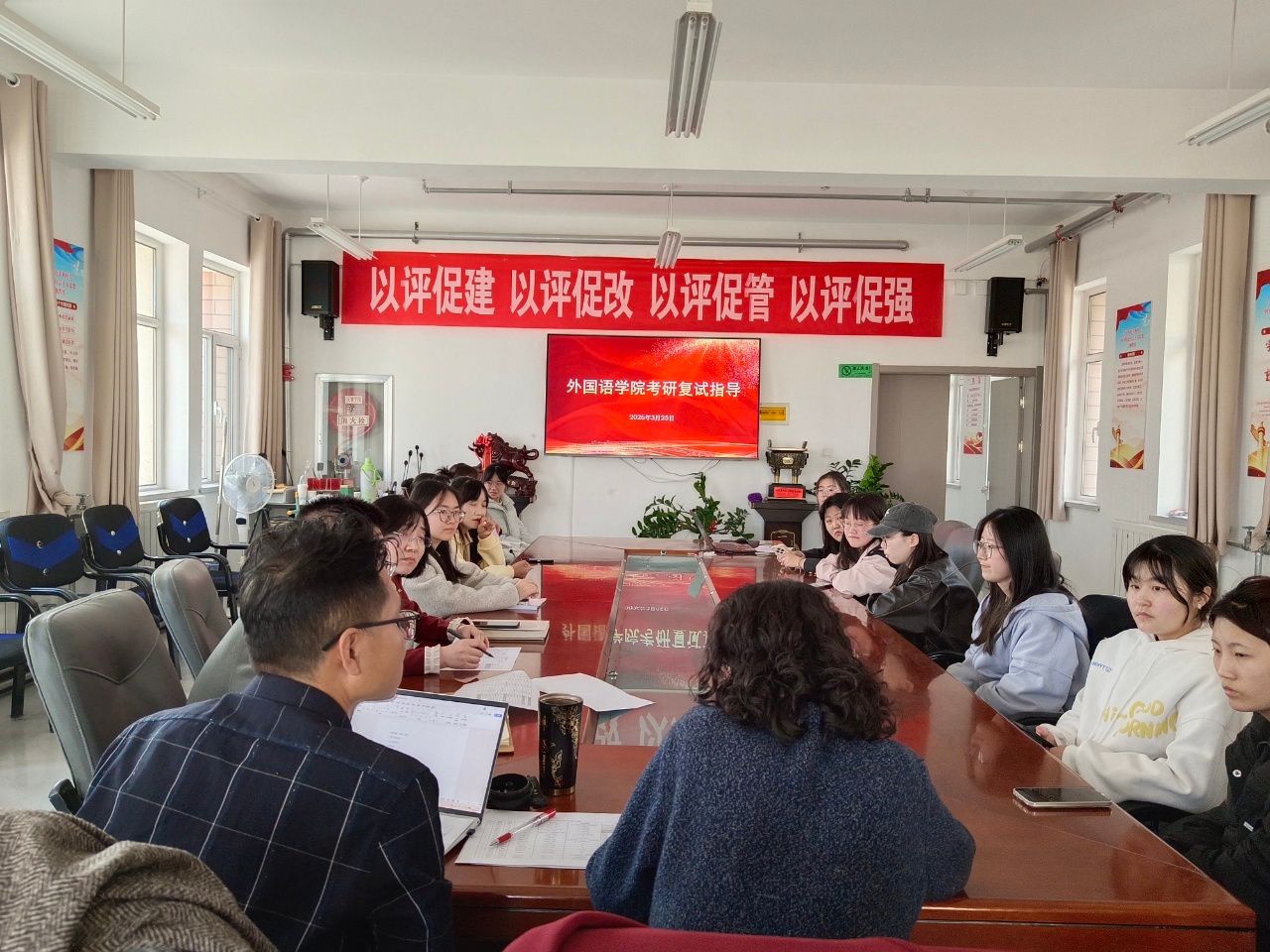 笔试方面,老师们紧扣外语专业特色,梳理复试笔试核心考点,明确复习重难点,分享高效备考策略与答题思路,提升答题效率。就面试环节,老师们重点讲解了面试流程、应答逻辑、语言表达规范与临场礼仪,针对专业问答、外语即兴表达等高频考查内容逐一点拨,纠正常见问题。同时,鼓励同学们调整心态,保持自信从容,以积极状态迎接复试。